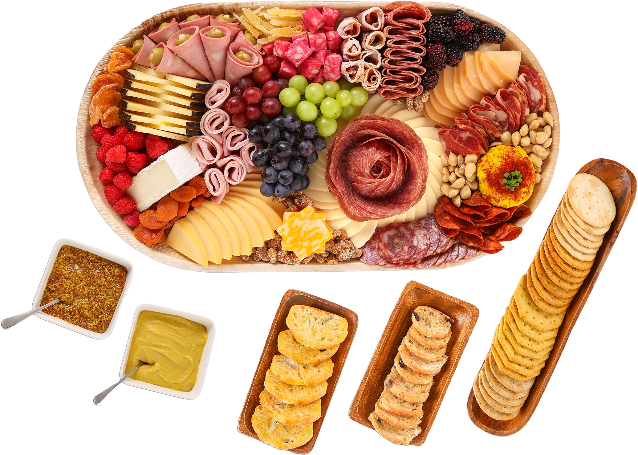 A selection of imported meats and cheeses; genoa salami, hot and sweet capicolas, mortadella with pistachios, sopressata, jambon de paris, chorizo, serrano ham, manchego, provolone, edam, aged gouda, double cream brie, port wine, colby, and smoked mozzarella spread. garnished with fresh and dried fruits, nuts, mustards, crostini, and crackers.