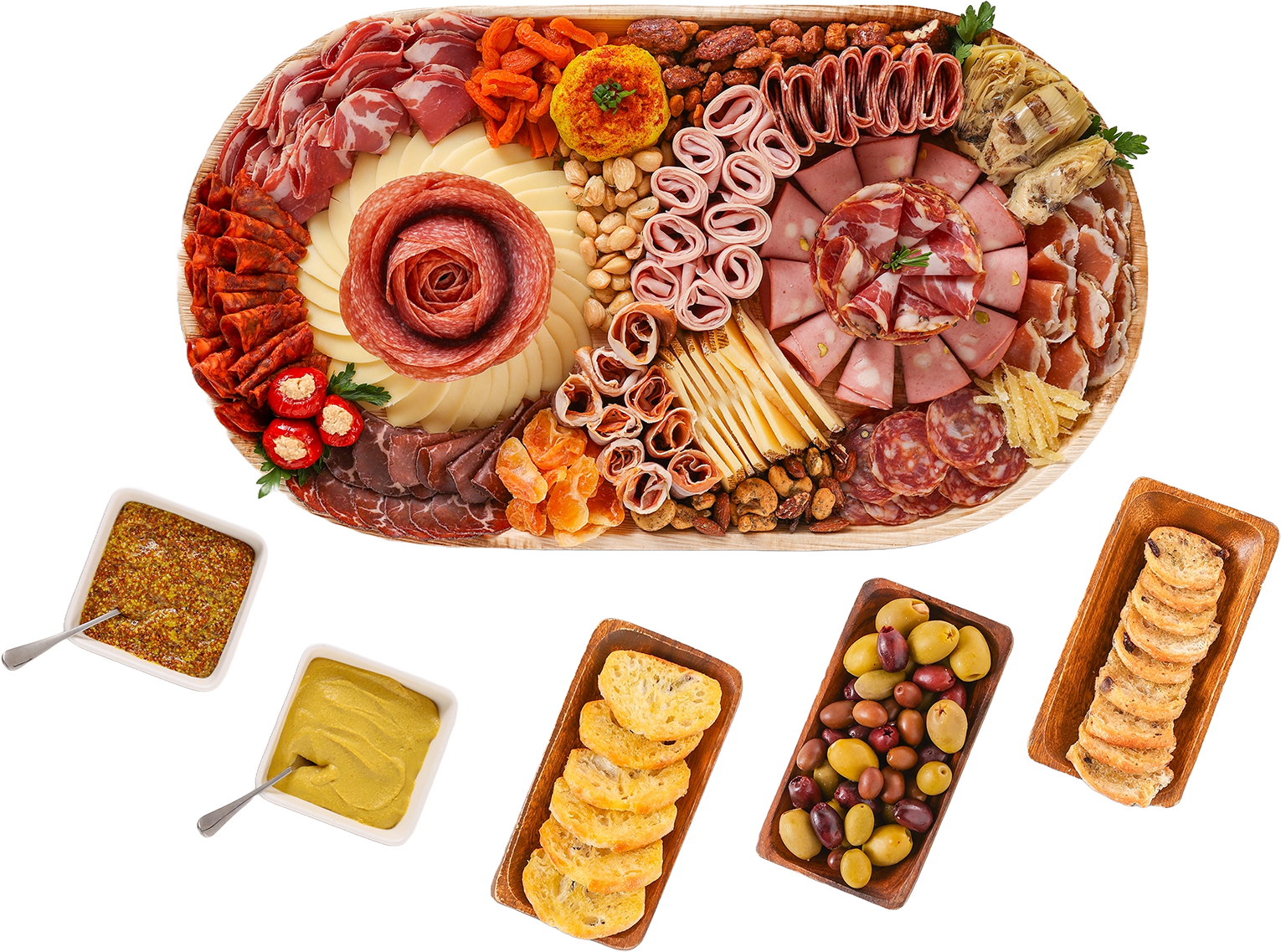 A selection of imported meats; genoa salami, hot and sweet capicolas, mortadella with pistachios, sopressata, jambon de paris, chorizo, and serrano ham. garnished with manchego, provolone, smoked mozzarella spread, nuts, dried fruits, olives, crostini, and mustards.